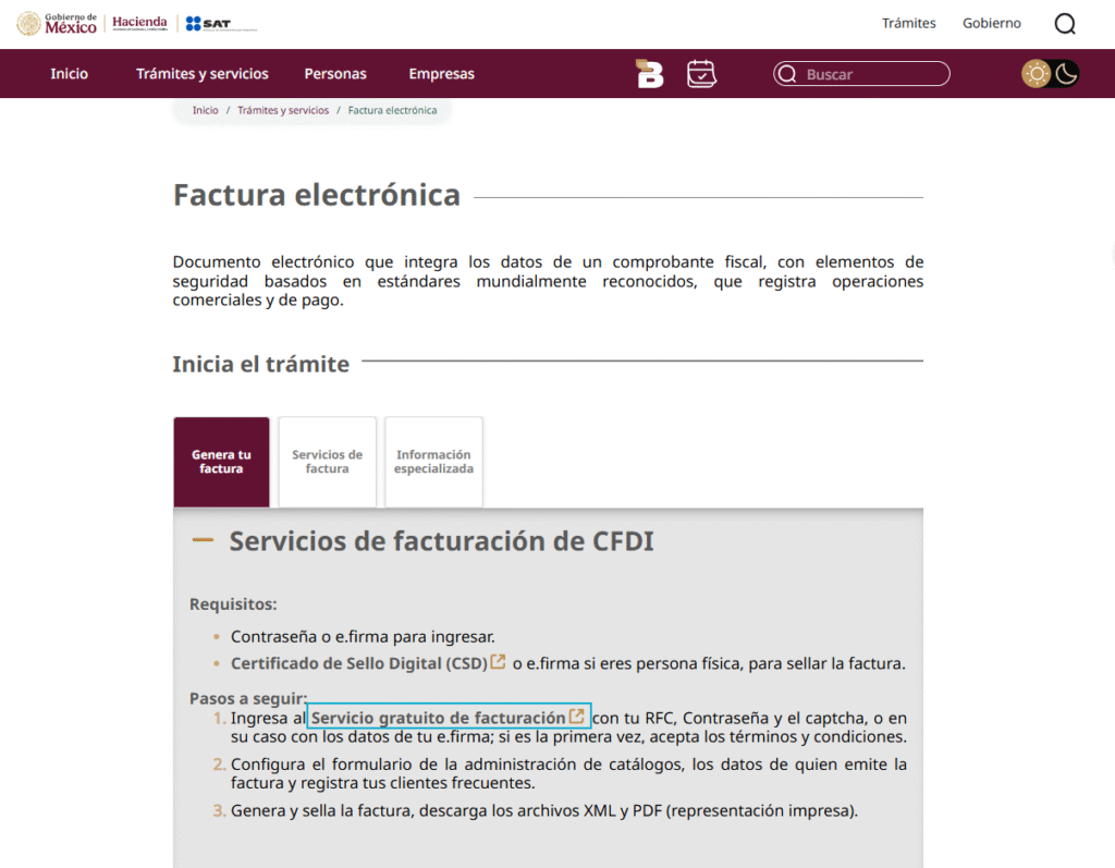 Accede a la herramienta de facturación CFDI 4.0 desde la página oficial del SAT haciendo clic en Servicio gratuito de facturación. (https://www.sat.gob.mx/portal/public/tramites/factura-electronica